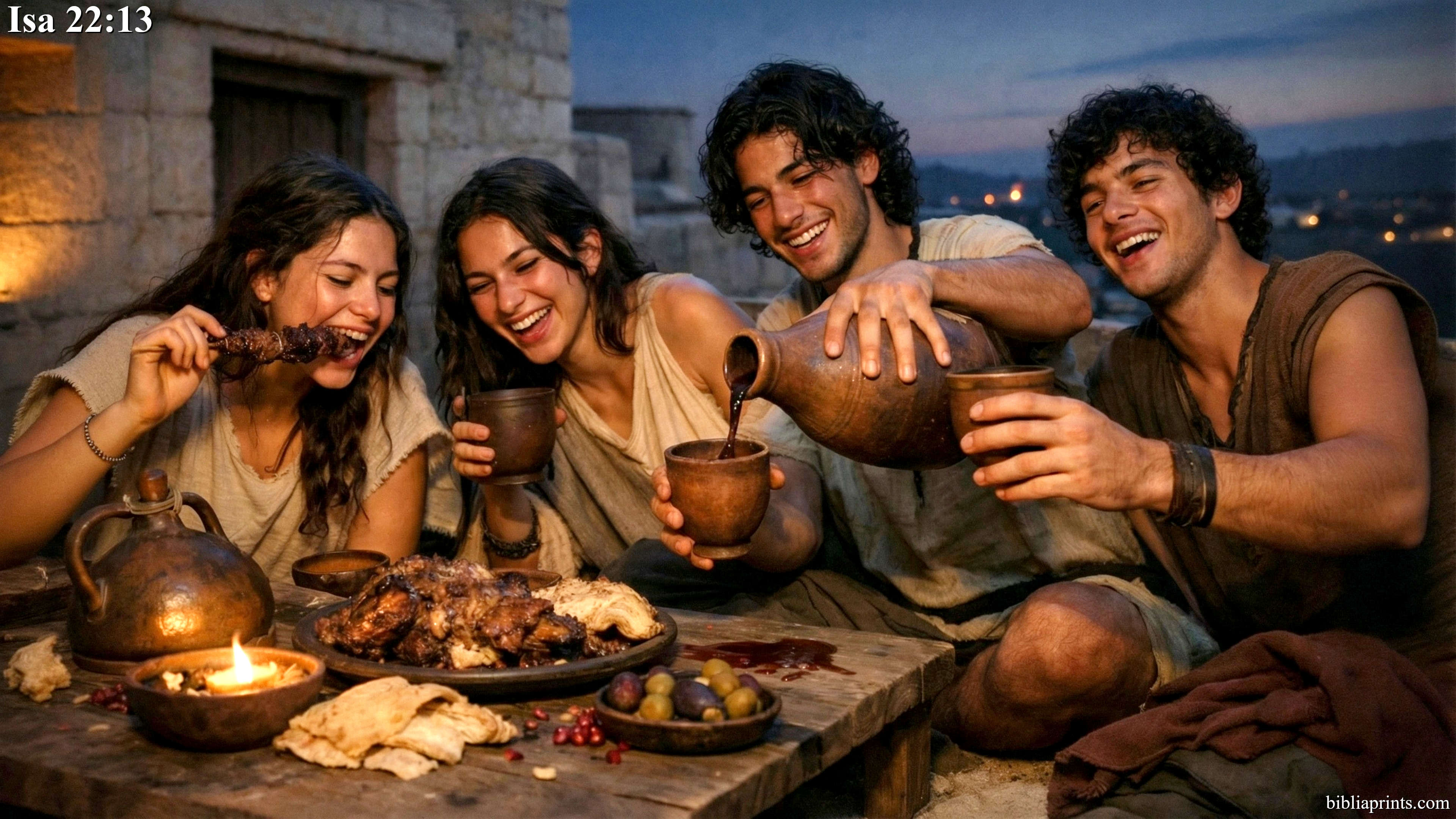 13 Yet, they were all happy and leaping for joy… slaughtering calves and offering sheep, then eating the meat and drinking the wine, and saying: ‘We should all eat and drink, for tomorrow we’re going to die!’