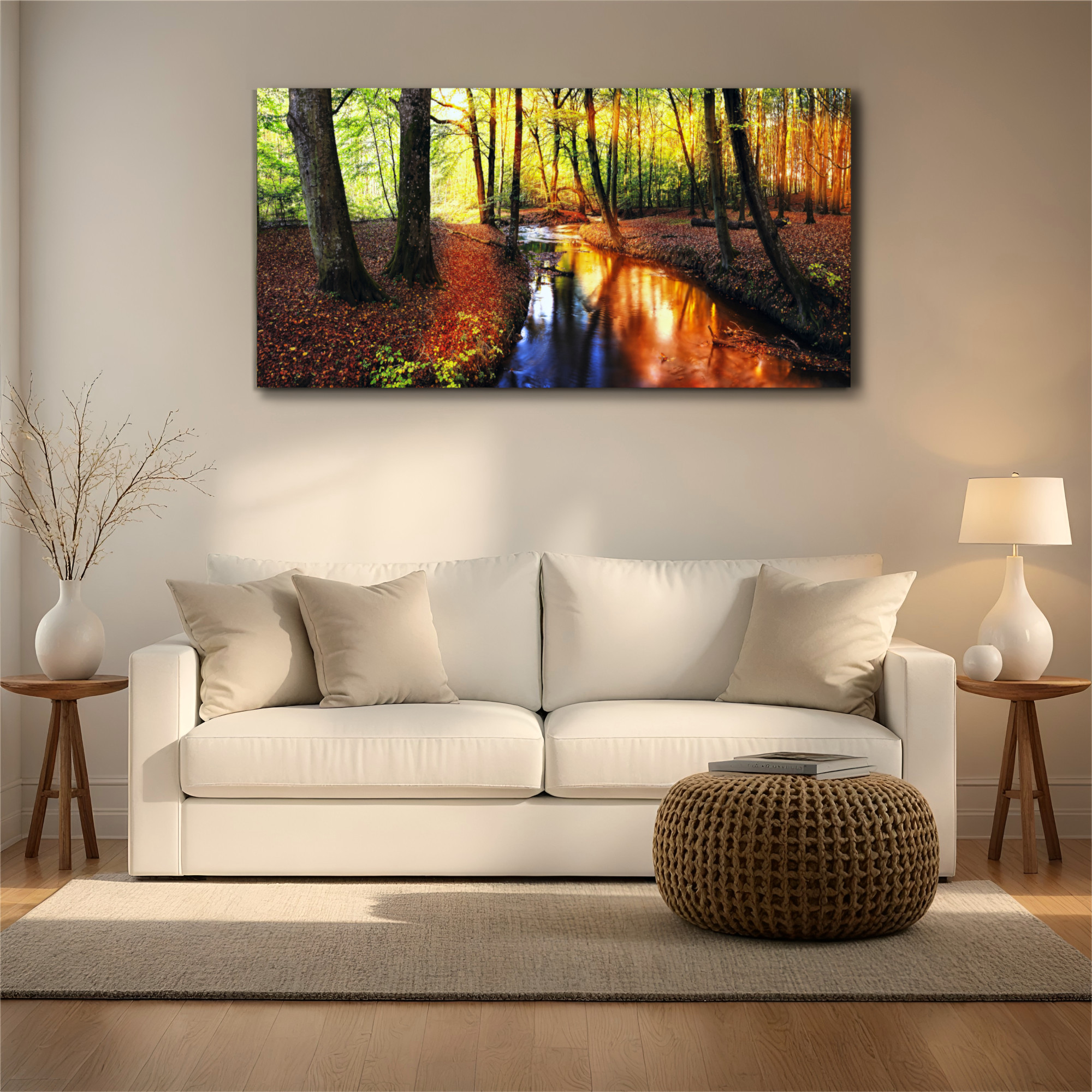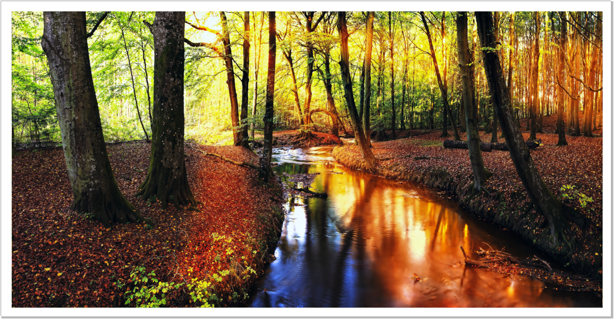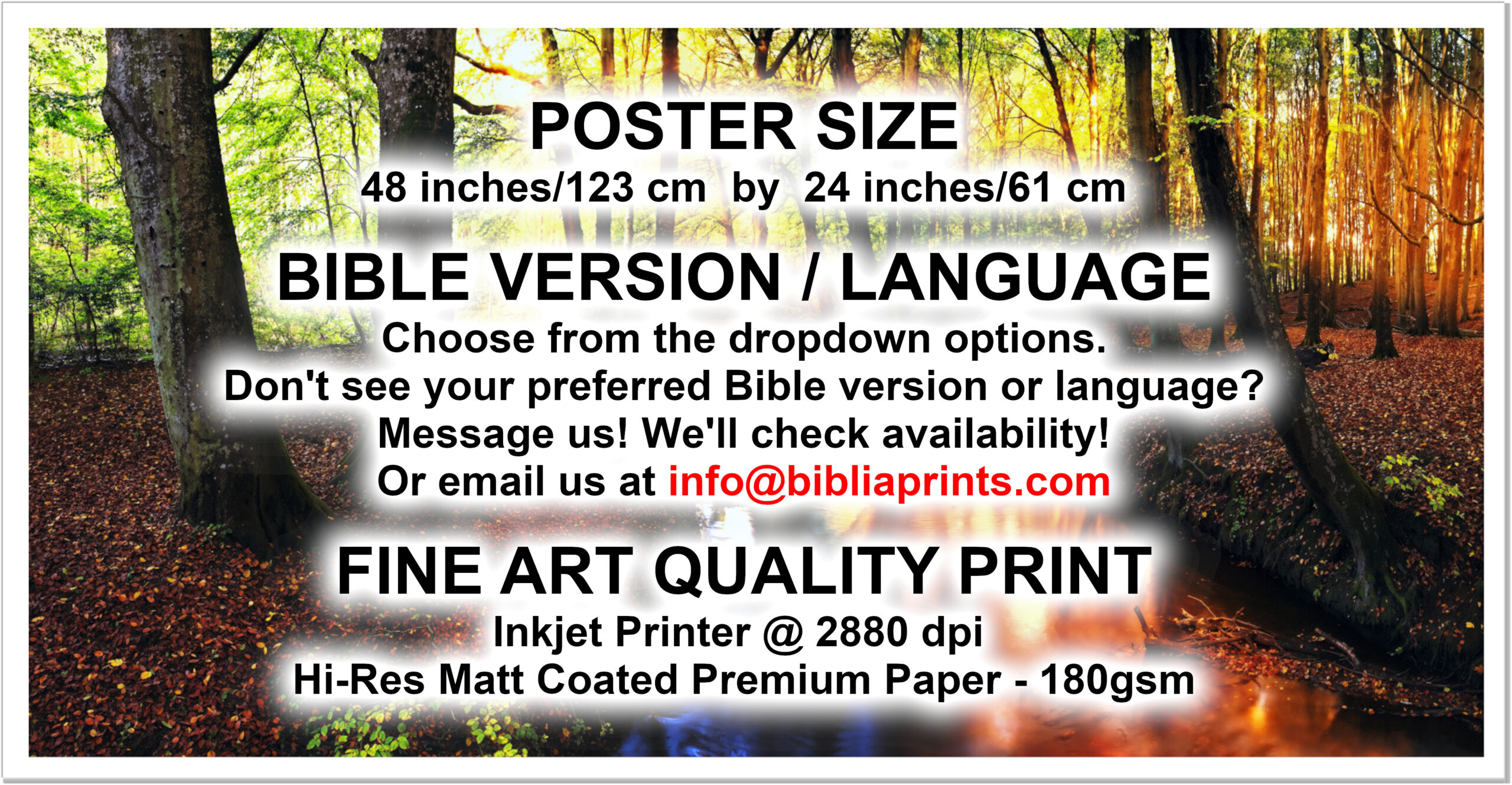 This Forest Poster features a forest with golden sunlight dancing through the towering trees, softly reflecting on a tranquil stream WITH the entire Bible text beautifully embedded into the artwork!
