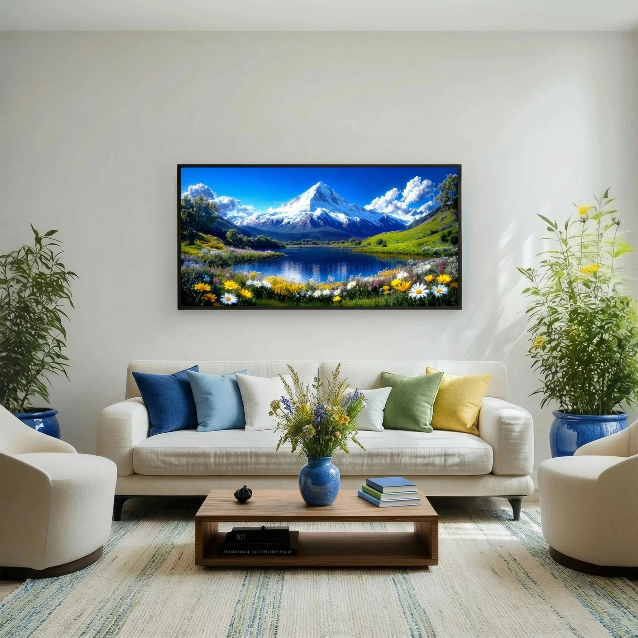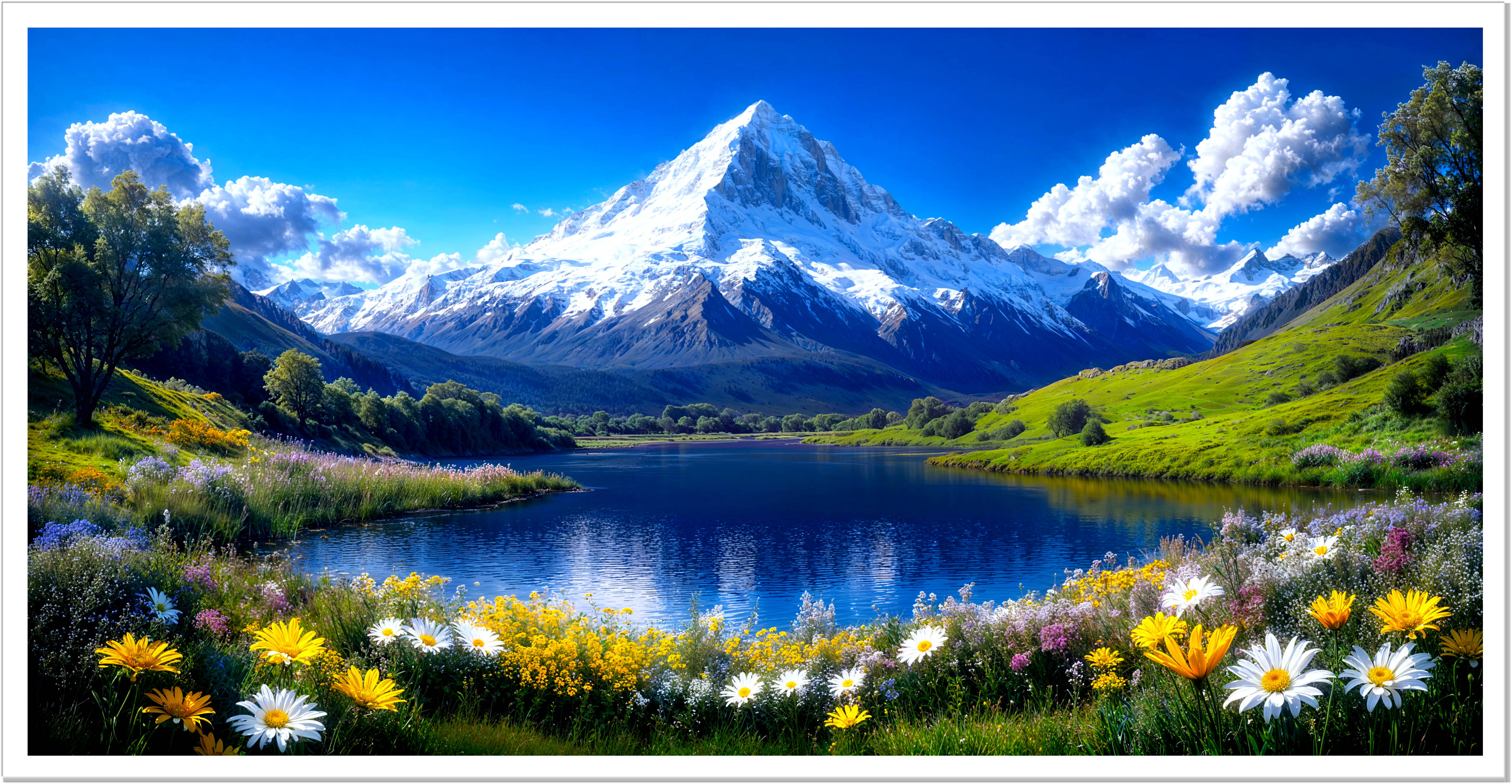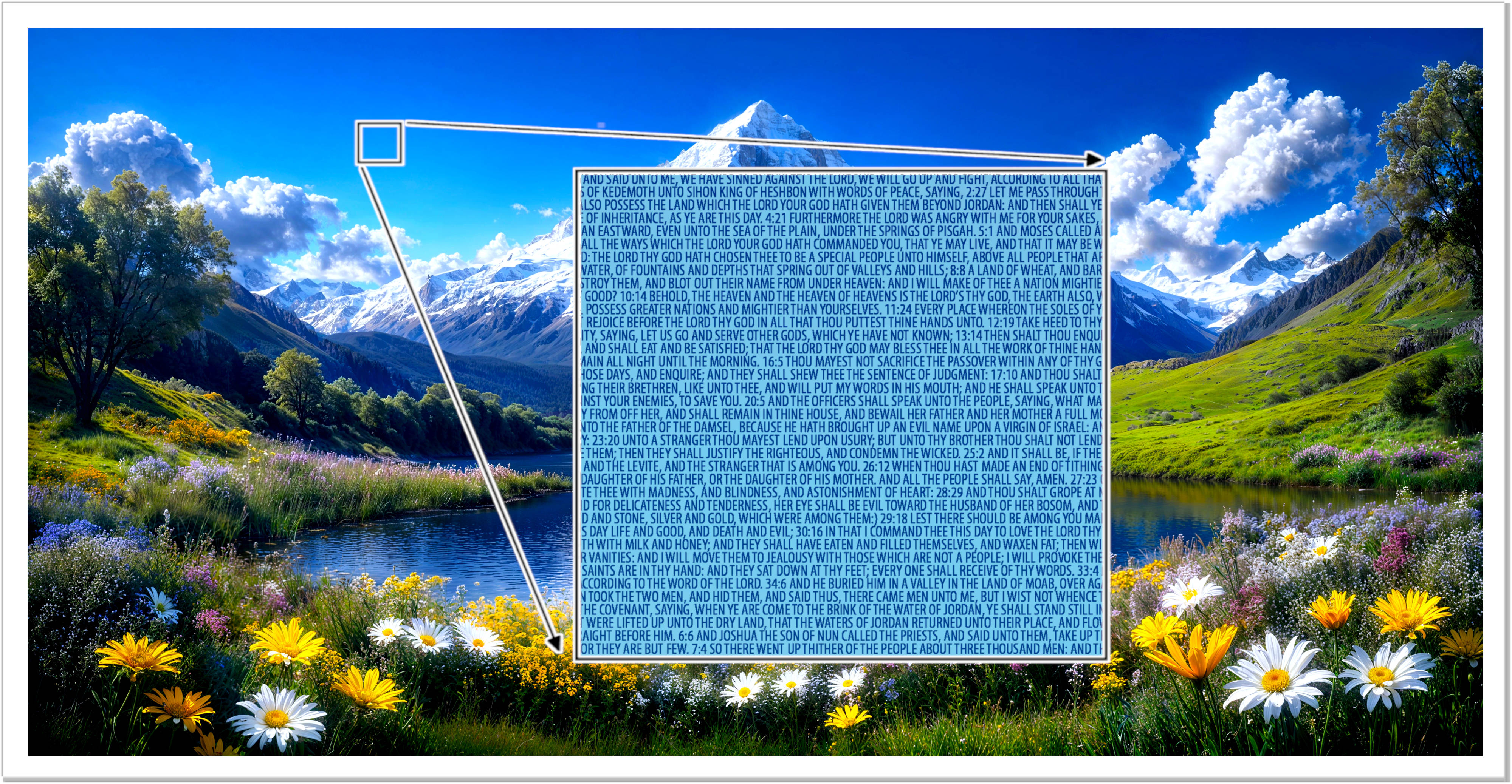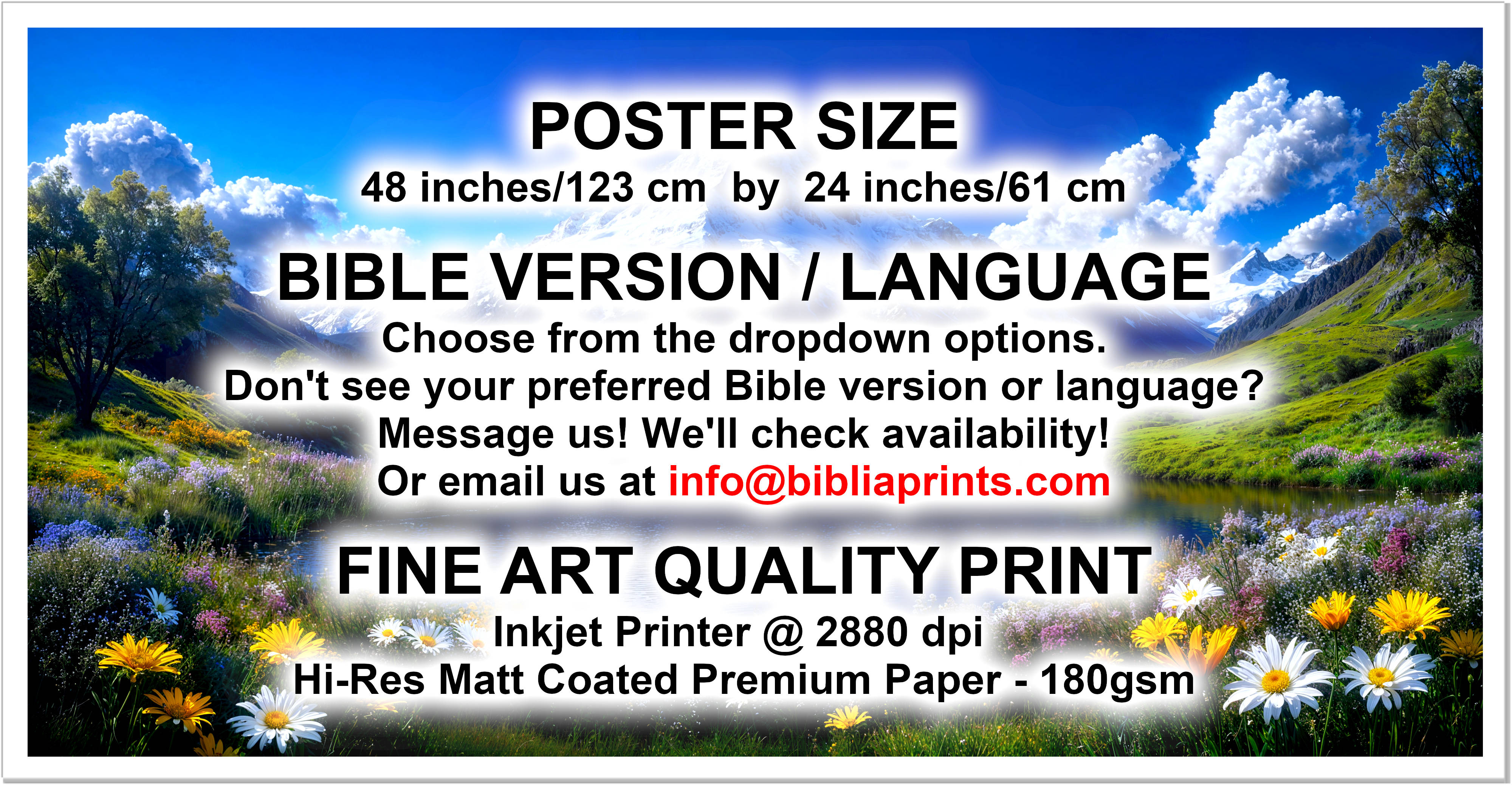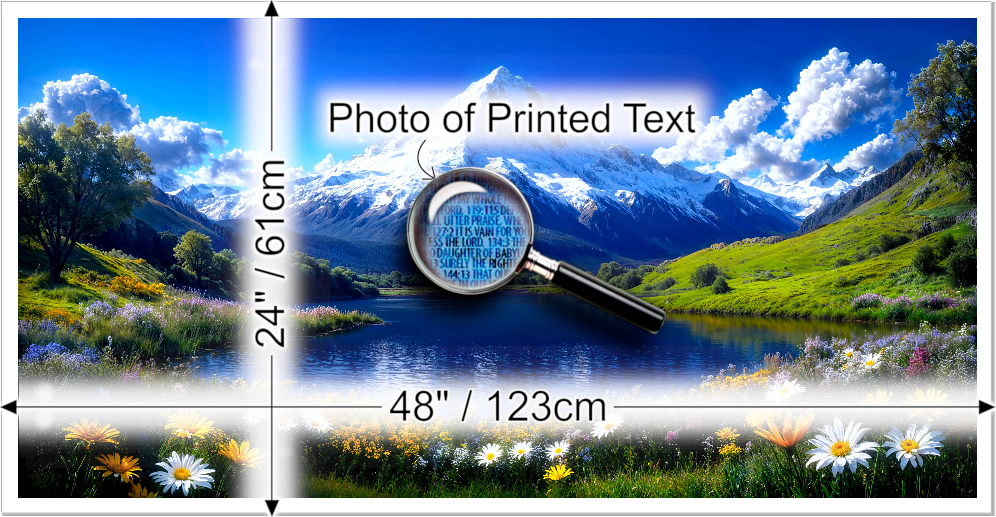 This Majestic poster features a snowcapped mountain above a tranquil lake and blooming wildflowers, with the entire Bible text beautifully embedded in the artwork!